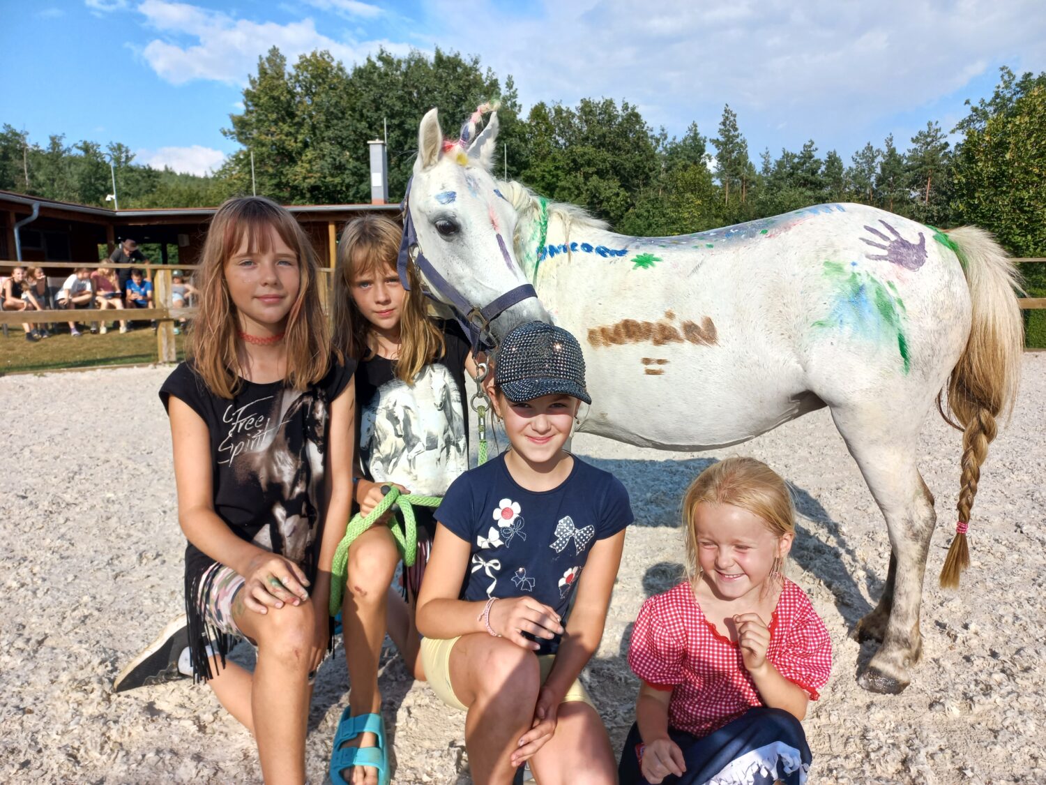 Celodenní pobyt u koní s jezdeckým výcvikem a doplňkovým programem dle věku dětí.