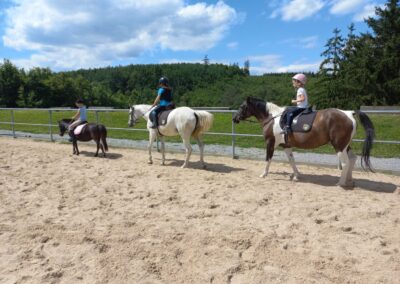 Děti jsou rozděleny podle pokročilosti a věku do dvou skupinek. Každá skupinka má denně jezdecký výcvik, kde má každý jezdec svého koníka, kromě ježdění je zajištěn zábavný doplňkový program.