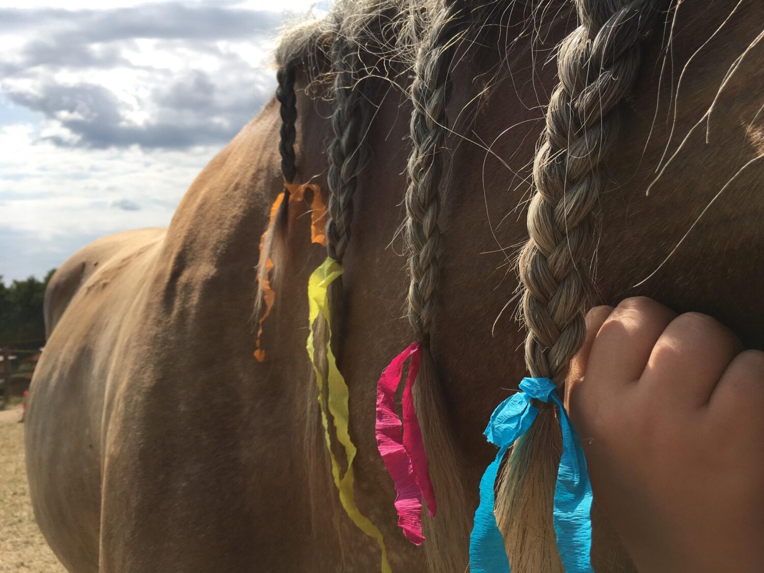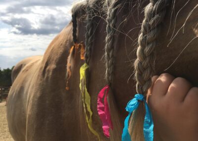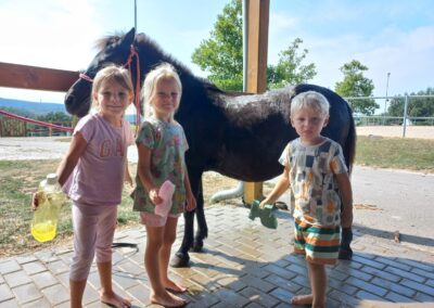 Skupinka, která zrovna nejezdí, má speciální program – rukodělné výrobky, hry s koňskou tématikou, praktické ukázky zacházení s koněm, celotáborová hra apod.
