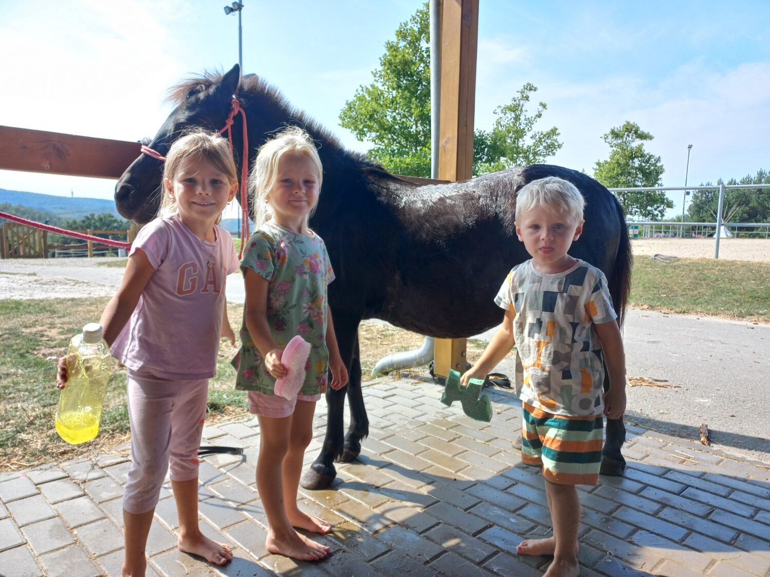 Dopoledne seznámení s koníky, čištění, sedlání a příprava koní, jezdecký výcvik.